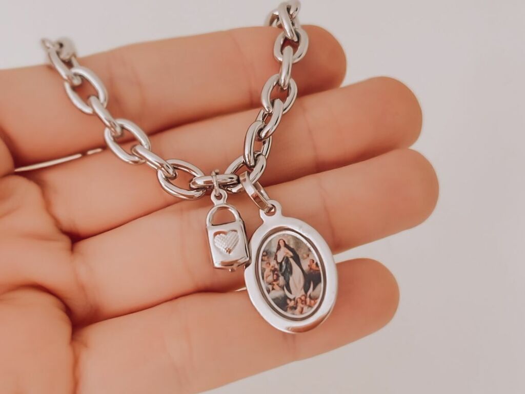 - Material: Aço inox (corrente, medalhas e cadeado)